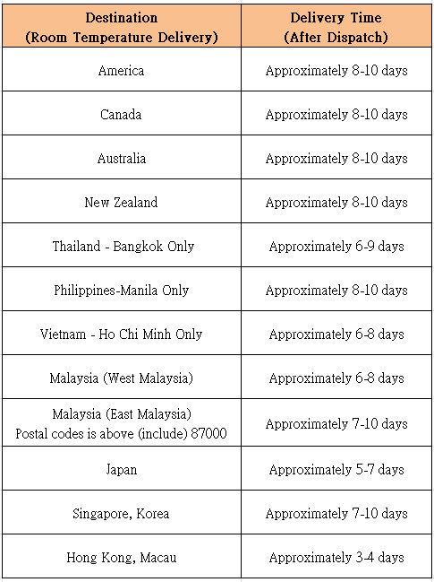 - 06. Delivery addresses for America, Canada, Australia, New Zealand, Malaysia, Singapore, Thailand(Bangkok), Philippines(Manila), Vietnam(Ho Chi Minh), Korea, and Japan has to be in English. Receiving addresses for Malaysia and Japan cannot be company addresses.