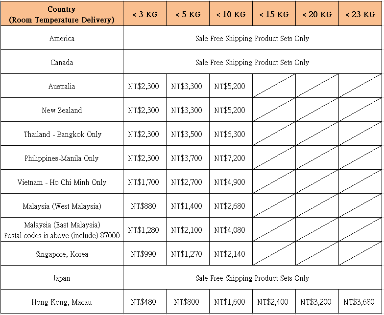 - - Delivery is free for orders above NTD 3,800(for delivery of items that are in the same temperature range). For orders less than NTD 3,800, the delivery cost is 200 NTD. (This is only applicable for Taiwan main island)