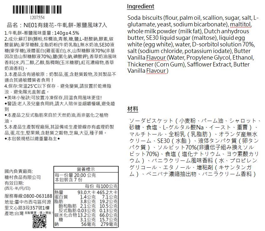 It is made from salty scallion soda biscuit, with the creamy and smooth filling, crispy and chewy taste. The sweet and salty snack makes your lip smacking!