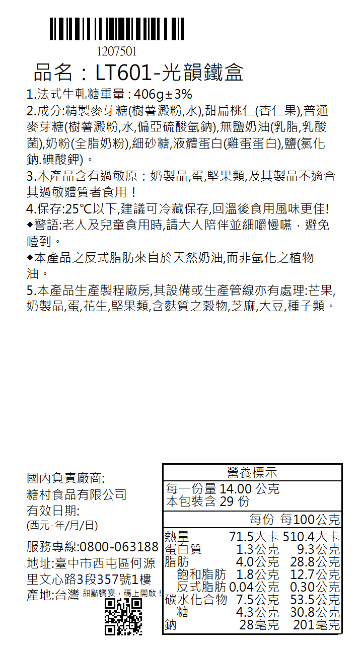 ★糖村牛軋糖堅持不加固化劑,因此產品會隨放置地點的溫度而改變產品外形及軟硬度;溫度低則會變硬易碎,這是正常物理現象,請放心食用。