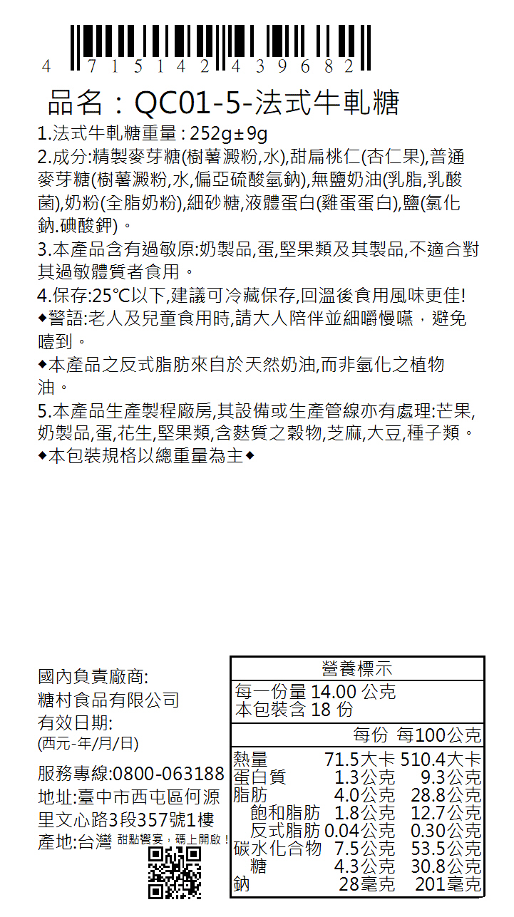 ★糖村牛軋糖堅持不加固化劑,因此產品會隨放置地點的溫度而改變產品外形及軟硬度;溫度低則會變硬易碎,這是正常物理現象,請放心食用。